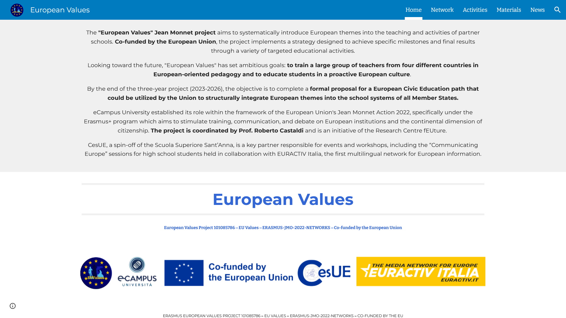 • Il progetto è coordinato dal prof. Roberto Castaldi. Si tratta di un’iniziativa del Centro di Ricerca che poggia sulla pluriennale esperienza di successo che il coordinatore ha conseguito a livello nazionale e continentale in materia di formazione, ricerca e comunicazione sul processo di unificazione europea. Il CesUE, società spin-off della Scuola Superiore Sant’Anna, è partner del progetto e realizzerà una serie di eventi ‒ in collaborazione con le scuole partner del progetto. Fra questi, verrà organizzato anche un workshop con studenti di scuola secondaria superiore sul tema “comunicare l’Europa”, in collaborazione con EURACTIV Italia ‒ il primo network multilingue di informazione europea.